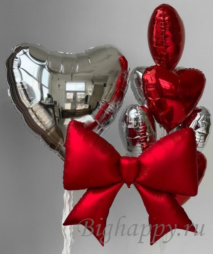 Эффектный набор с гелием, который сразу задаёт настроение праздника и роскоши. Контрастные сердца в красных и серебристых оттенках дополнены выразительным бантом, создавая цельную и стильную композицию. Идеально подойдёт для романтического сюрприза, годовщины или фотосессии. Такой декор привлекает внимание, подчёркивает важность момента и делает событие по-настоящему запоминающимся..