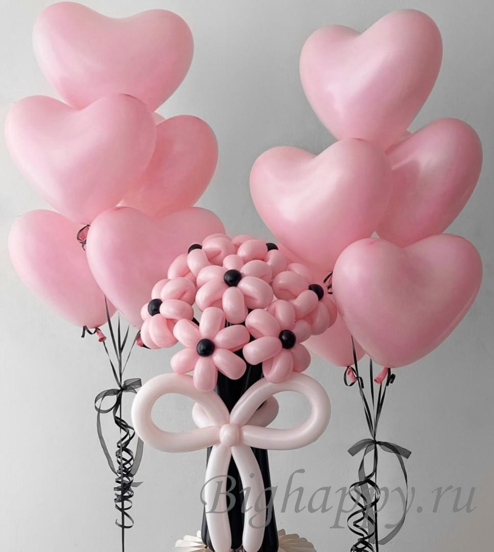 Воздушная композиция в нежно-розовой гамме с сердцами и изящным букетом создана для самых тёплых чувств. Идеальный вариант для признания в любви, предложения, годовщины или романтического сюрприза. Она станет эффектным акцентом на фотосессии или украшении интерьера, добавляя романтики и уюта в любое пространство. Каждый элемент продуман до мелочей, создавая гармоничный и восхитительный образ.
