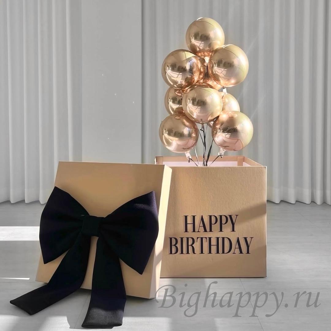 Подарок, который завораживает с первого взгляда! В элегантной бежевой коробке с чёрным бантом скрыт настоящий фонтан праздничного настроения. Искрящиеся золотые фольгированные сферы создают ощущение роскоши и торжества, а индивидуальная надпись на коробке делает момент по-настоящему уникальным. Идеальный способ удивить и вдохновить близких на праздник!