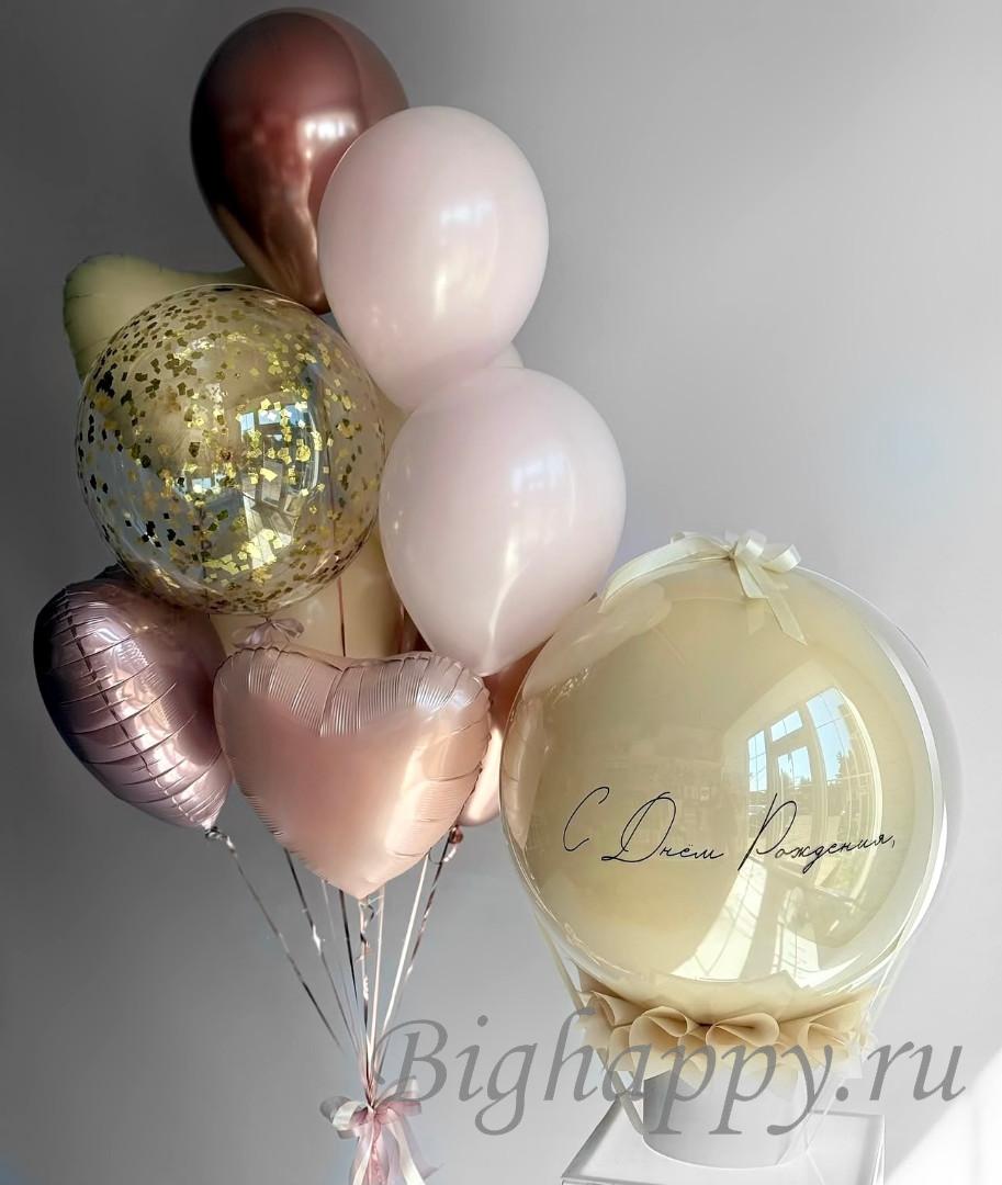 Стильная композиция для яркого настроения. Нежный баблобокс с шаром со «стеклянным» эффектом и вашей надписью, изящный фонтан из пудровых, бежевых и нежно-розовых оттенков, фольгированные сердечки и прозрачный Bubbles с золотым конфетти создают атмосферу теплоты и праздника. Идеально для поздравлений, сюрпризов и эффектных фото.