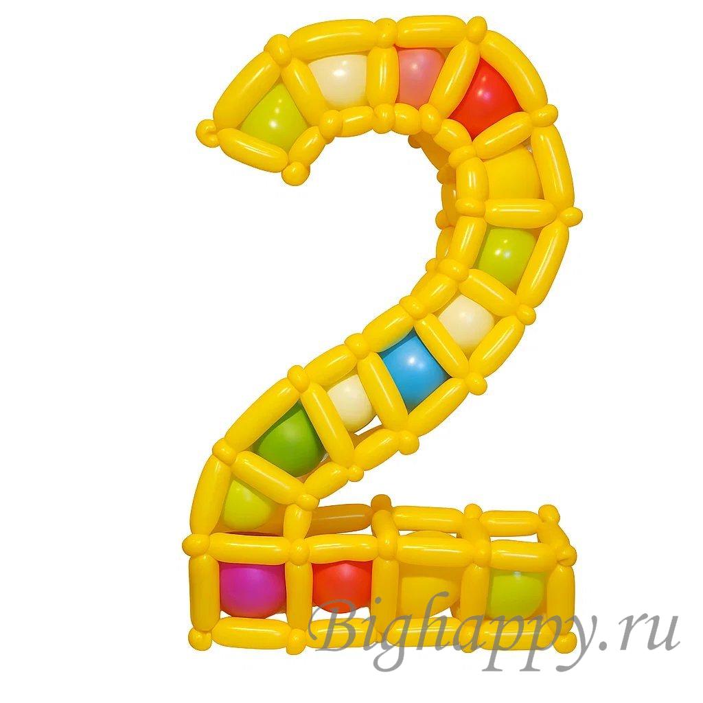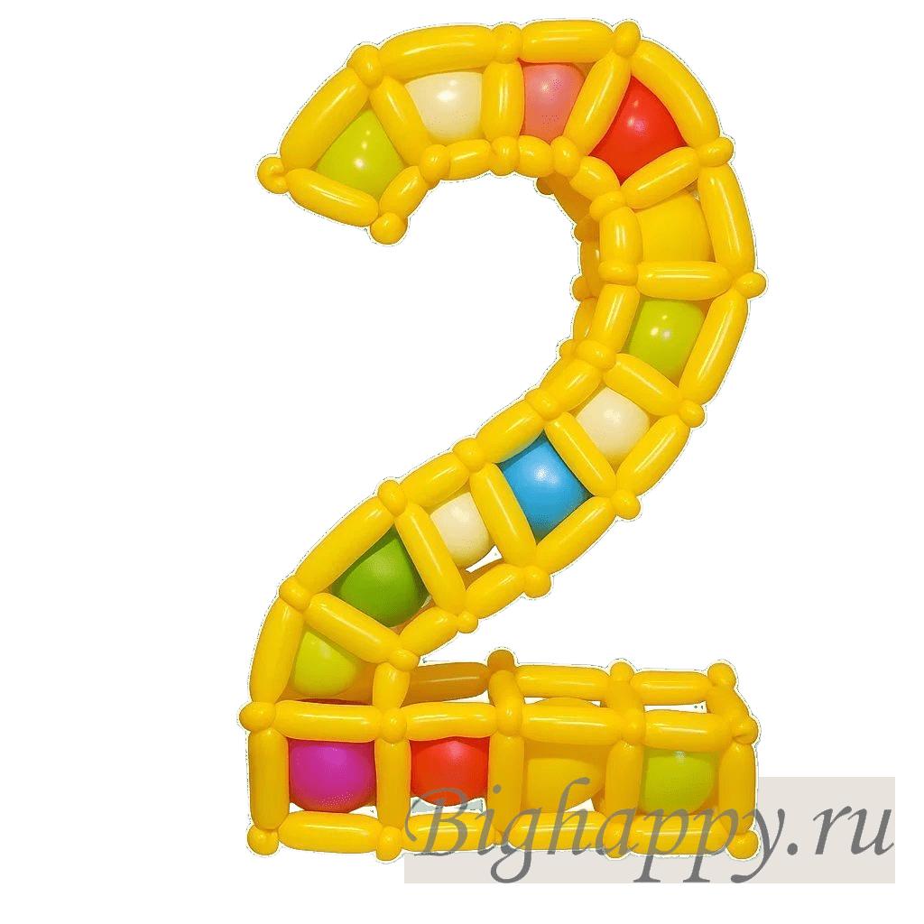 Яркая и оригинальная фигура в форме цифры 2 станет эффектным акцентом на дне рождения, юбилее или тематическом празднике. Конструкция выполнена из жёлтых шаров для моделирования, образующих каркас, внутри которого расположены разноцветные вставки — зелёные, красные, голубые, розовые и белые.