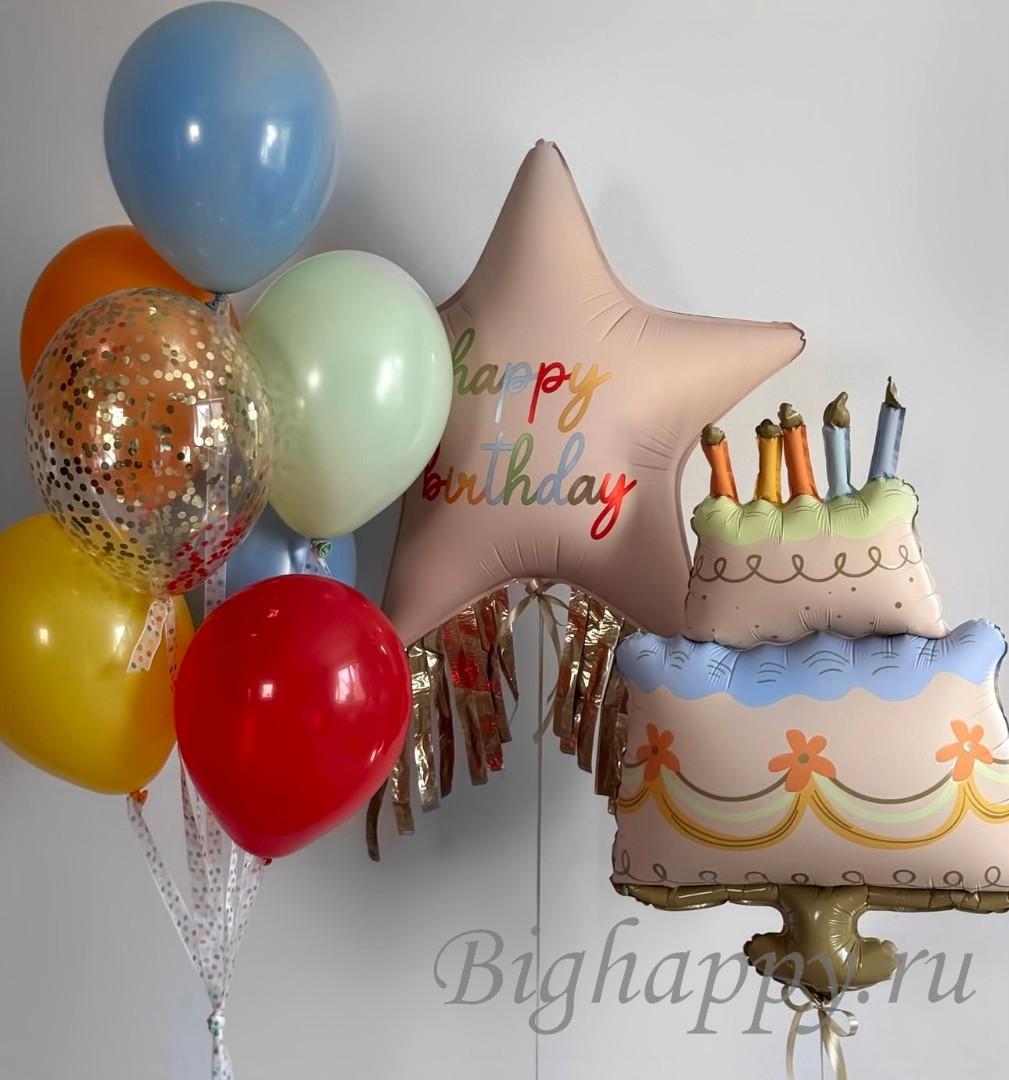 Создайте атмосферу радости и тепла с яркой композицией для дня рождения! Праздочный торт с разноцветными свечами, звезда с надписью «happy birthday» и воздушные шары в пастельных и сочных тонах добавят веселья и уюта. Такой набор станет отличным украшением для детского праздника или сюрпризом для близкого человека!