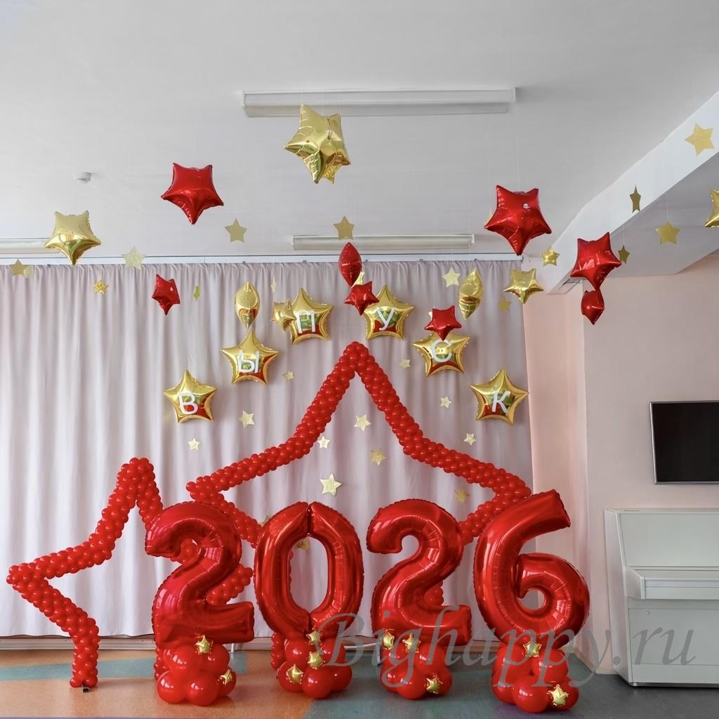 Яркое оформления выпускного, последнего звонка или праздничной фотозоны. Эффектные цифры года, композиции в форме звёзд и насыщенные оттенки создают атмосферу торжества и радости. Идеально подходит для украшения зала, сцены или класса, помогает подчеркнуть значимость события и сделать фотографии по-настоящему запоминающимися. Готовое решение для стильного праздника и сильных эмоций.
