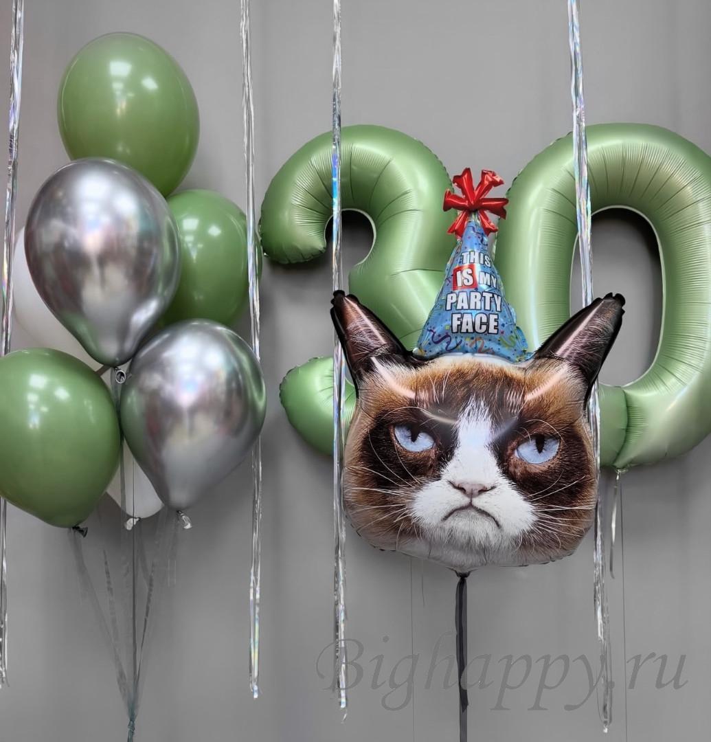 Идеальный вариант для тех, кто ценит ироничный юмор! Забавный кот в праздничном колпаке с надписью «This is my party face» добавит веселья любому дню рождения. Большие цифры и латексные шары в зелёно-серебристой гамме создают стильный фон для фото и поднимают настроение всем гостям. Отличный способ отметить юбилей с улыбкой!
