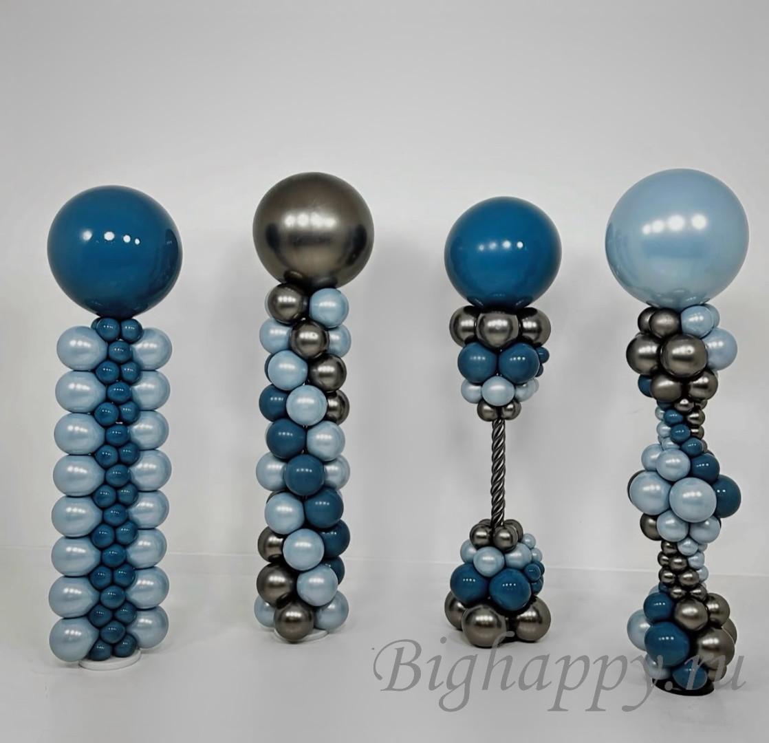 Эта стойка в холодных оттенках сразу делает пространство более стильным и собранным. Сочетание глубокого синего, дымчато-серого и светлых тонов выглядит современно и аккуратно. Такое оформление подойдёт для деловых мероприятий, презентаций и корпоративов. Композиция визуально добавляет объём, притягивает внимание гостей и хорошо смотрится на фотографиях. Универсальный формат легко вписывается в залы, студии и торговые пространства, не перегружая интерьер. Стойка из шаров станет лаконичной и заметной деталью декора.