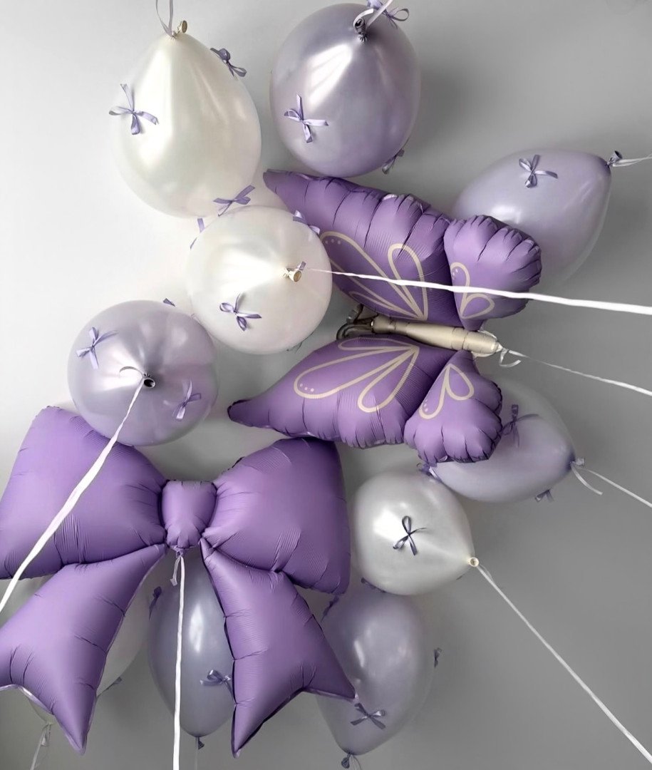 Подарите атмосферу уюта и праздника с этой нежной композицией в лавандовых и кремовых оттенках. Фигуры в виде банта и бабочки создают стильный акцент и привлекают внимание. Набор отлично подойдёт для детского праздника, дня рождения или фотосессии, добавляя пространству лёгкость и радость. Прекрасный вариант для оформления и создания праздничного настроения.