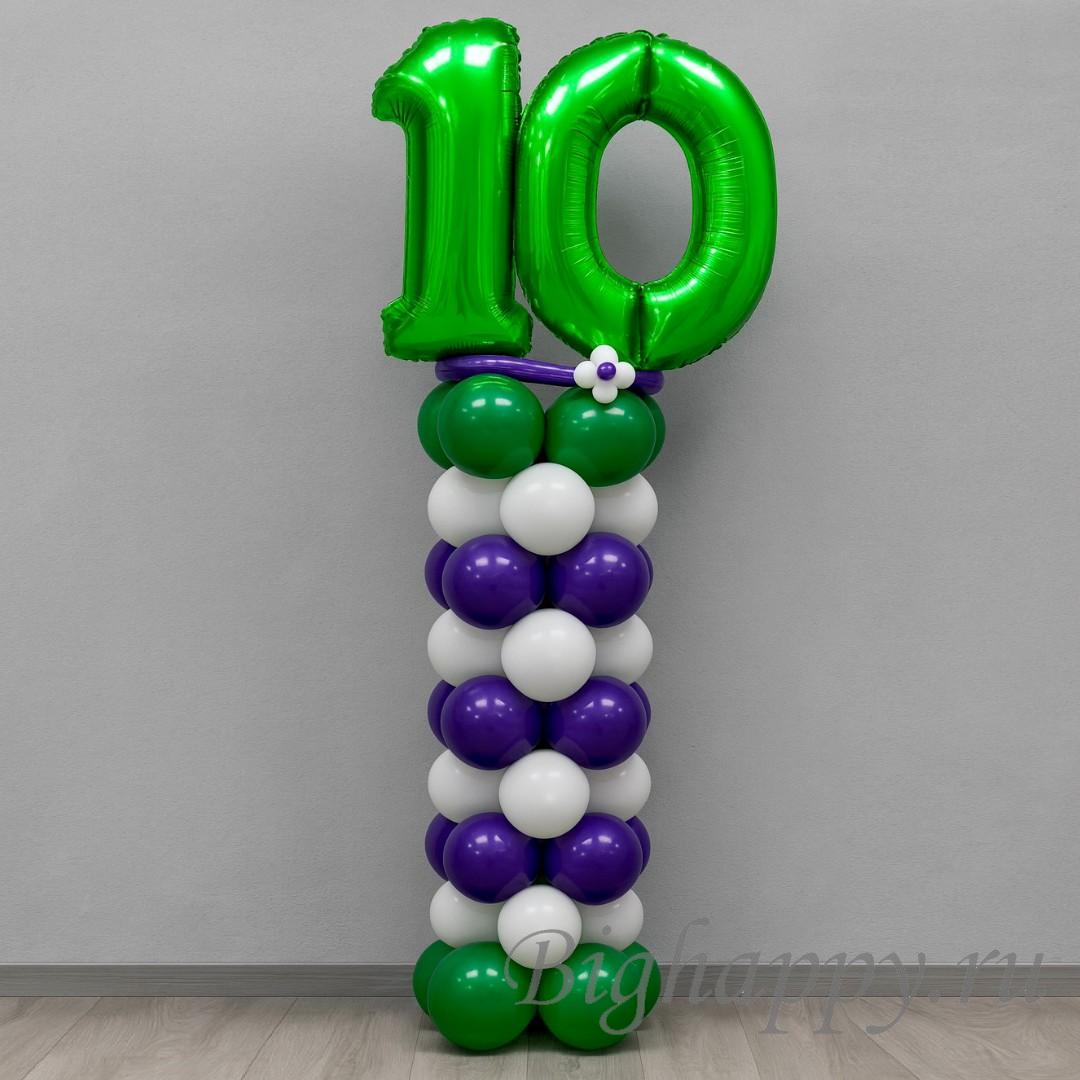 Композиция для украшения юбилея выполнена в виде высокой стойки с двумя фольгированными цифрами на вершине. Стойка изготовлена из латексных круглых шариков белого, жёлтого и фиолетового цвета. Золотые цифры прикреплены к ней наискосок и перетянуты шариком для моделирования с небольшим цветочком.