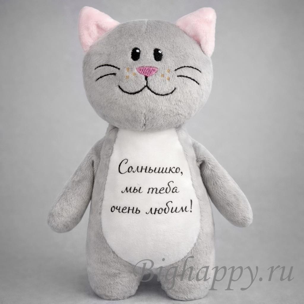Такой вариант идеально подойдёт для подарка ребёнку, близкому человеку или как трогательный знак внимания без повода. Надпись располагается на животике игрушки и гармонично вписывается в её дизайн, делая подарок уникальным и наполненным смыслом.
