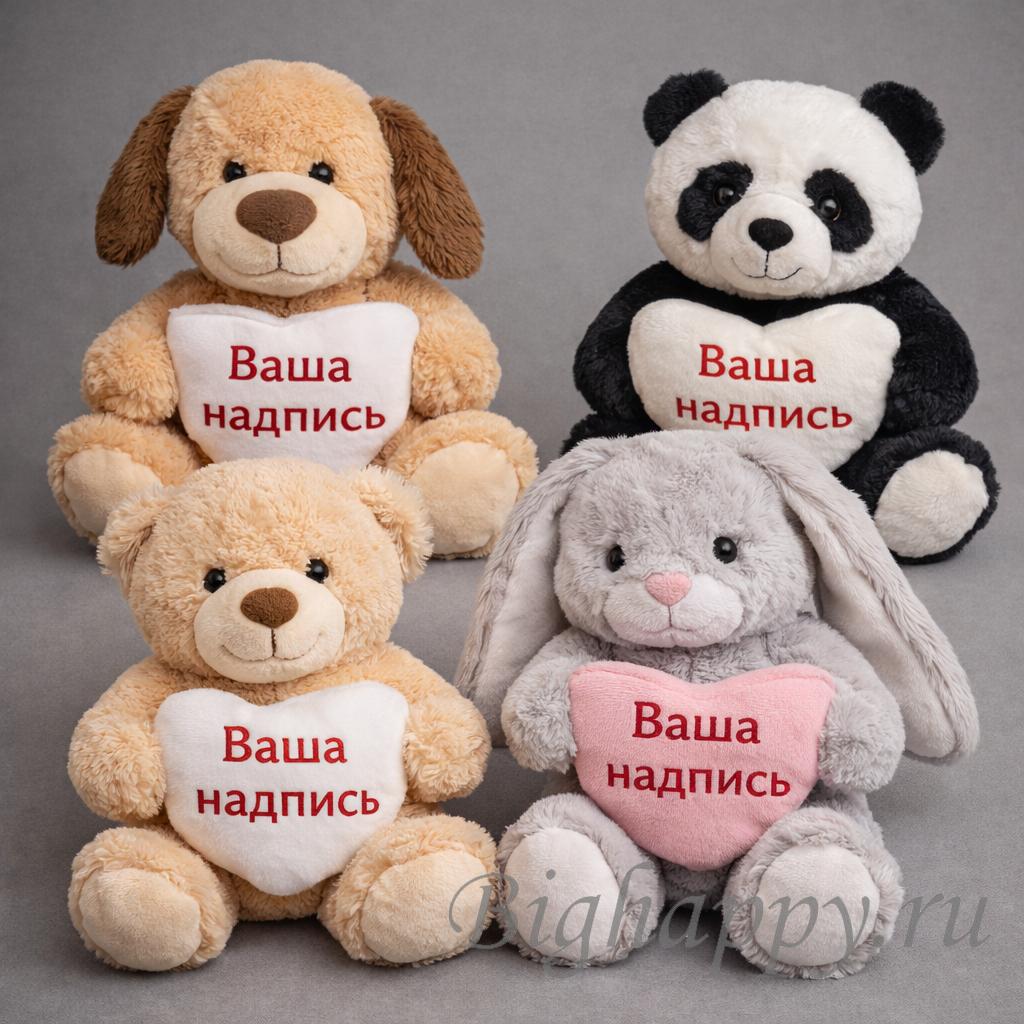 Печать наносится непосредственно на игрушку. Текст выглядит аккуратно, хорошо читается и гармонично вписывается в дизайн. Можно выбрать именную надпись или оформить игрушку с поздравлением, пожеланием или важной датой — такой подарок будет радовать не только в момент вручения, но и долгое время после.