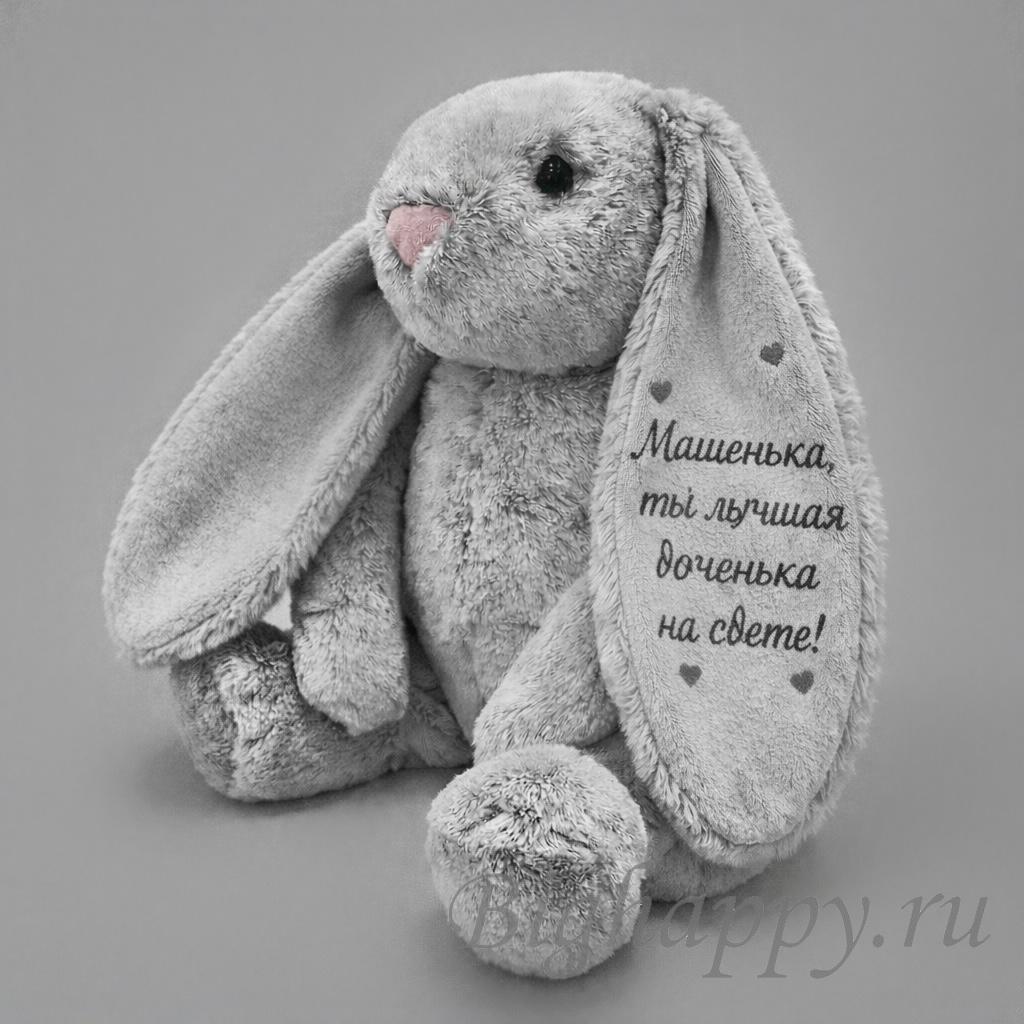 Кролик с длинными ушками хорошо подходит для размещения персонального текста — именно поэтому он часто выбирается для индивидуального оформления. Мягкая фактура и спокойный цвет делают надпись читаемой и визуально аккуратной.