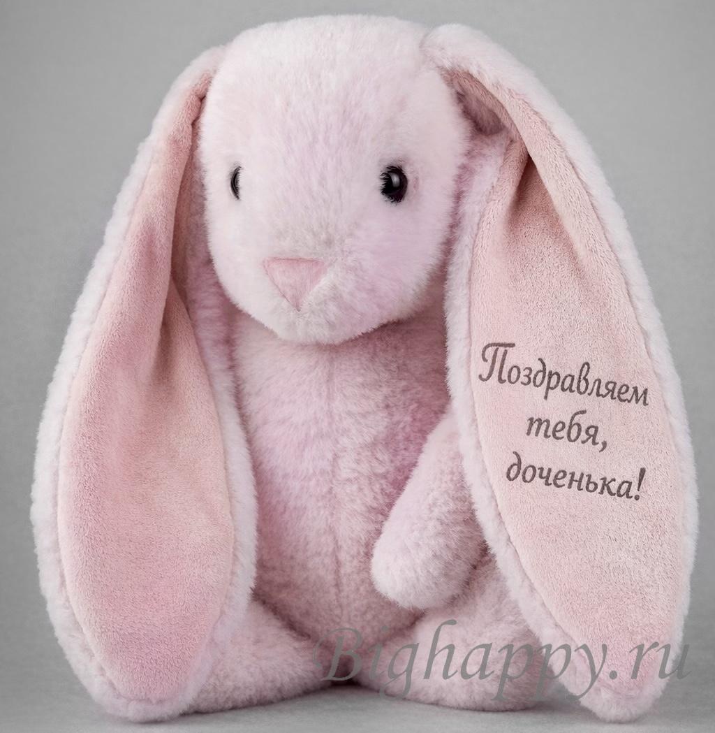 Милая плюшевая мягкая игрушка размером около 40 см в виде зайчика (представлены в разных оттенках, не только розовый, как на фото), на которой будет напечатано Ваше поздравление, имя виновницы праздника или любой текст по желанию.