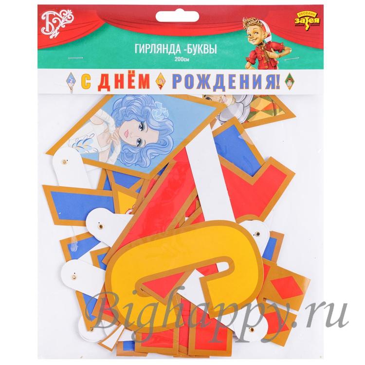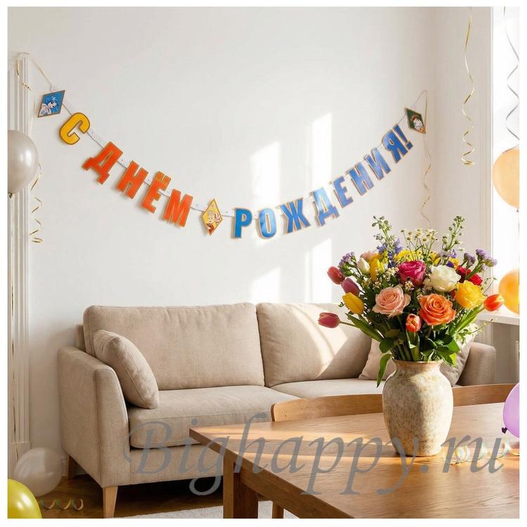 Буквы выполнены в насыщенных цветах и дополнены небольшими иллюстрациями персонажей сказки, что делает гирлянду живой и визуально интересной. Дизайн смотрится легко и нарядно: гирлянда хорошо читается на светлом фоне, добавляет интерьеру праздничное настроение и сразу задаёт тему торжества. Иллюстрации гармонично вписаны между буквами и поддерживают общую сказочную атмосферу, перекликаясь с другими элементами декора из серии «Буратино».