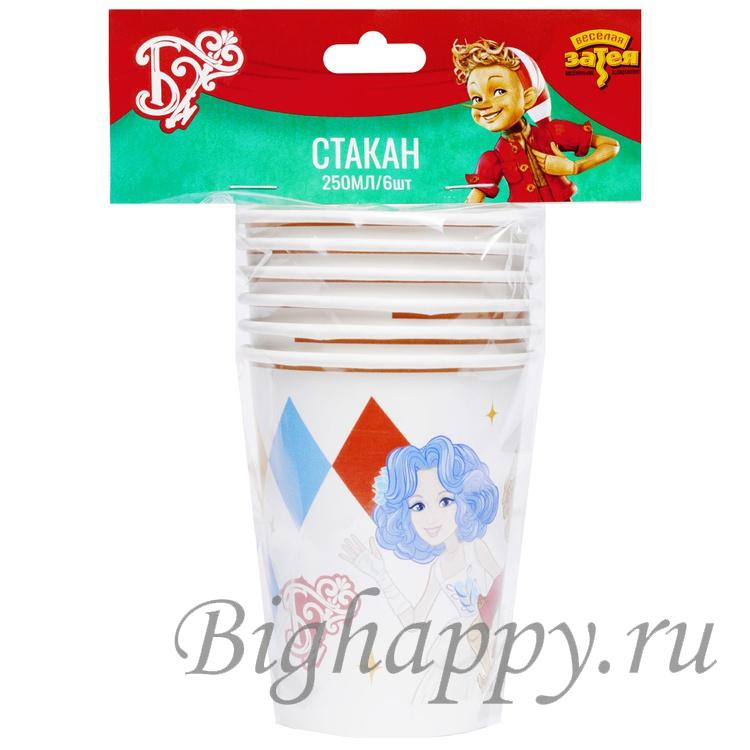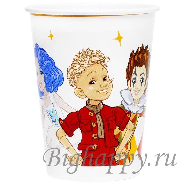 Тематические стаканчики 250 см для оформления праздничного стола, в наборе 6 шт. Украшены изображениями главных героев любимой сказки «Буратино». Персонажи знакомы и любимы многими поколениями: весёлый и озорной Буратино, нежная Мальвина и Арлекин вызывают у детей живой интерес.