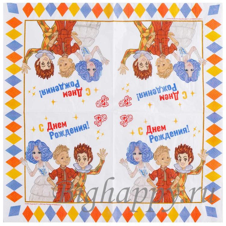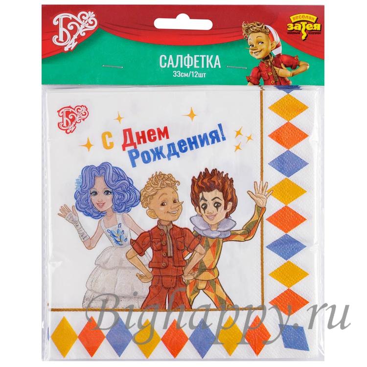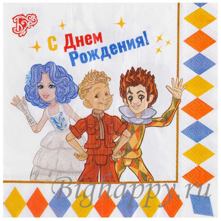 Салфетки с яркими иллюстрациями любимых сказочных персонажей. В центре дизайна — Буратино, Мальвина и Арлекин, изображённые в живой, выразительной манере с акцентом на эмоции и движение.