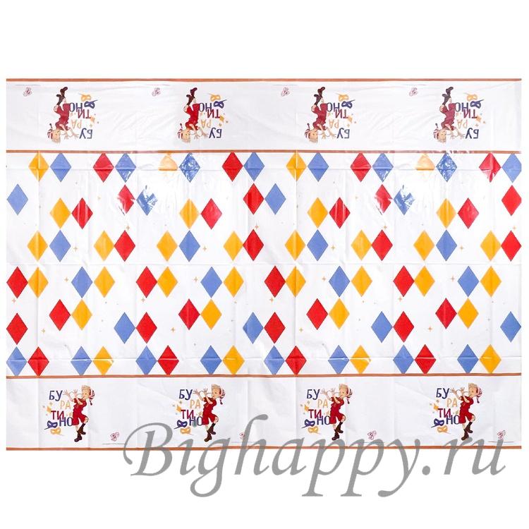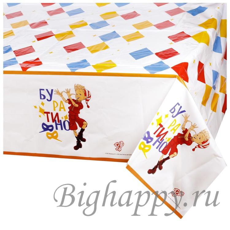 Праздничная скатерть оформлена ярко и динамично, с акцентом на сказочный сюжет и атмосферу весёлого представления. В центре внимания Буратино — подвижный, жизнерадостный, с характерной мимикой и жестами, передающими настроение игры и озорства.